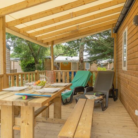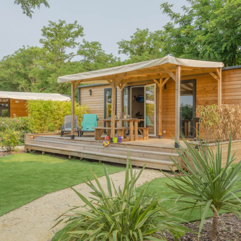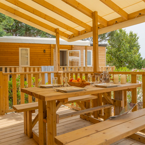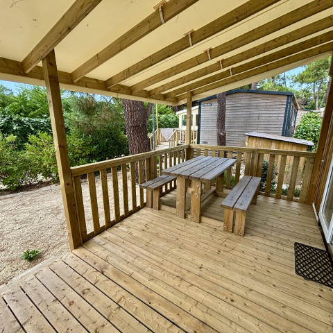 ¿Qué te parece añadir una terraza privada con mobiliario de jardín a tu alquiler de mobil home económico en la isla de Ré para tus vacaciones en Charente-Marítima, Francia? Todas las viviendas del camping Sea Green Les Grenettes cuentan con una hermosa terraza de madera, cubierta o semi-cubierta. Este espacio adicional, abierto al exterior, es una gran ventaja al alquilar un mobil home en una región soleada como Charente-Marítima, especialmente en verano.